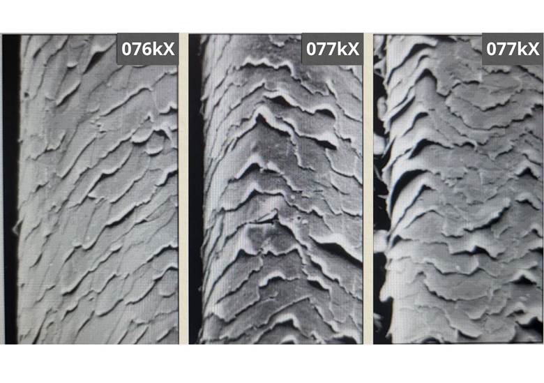 Малюнок 1: поверхня волосяного волокна, що демонструє ефект збільшення кількості циклів нарощування (10% нарощування при 10% відносної вологості).